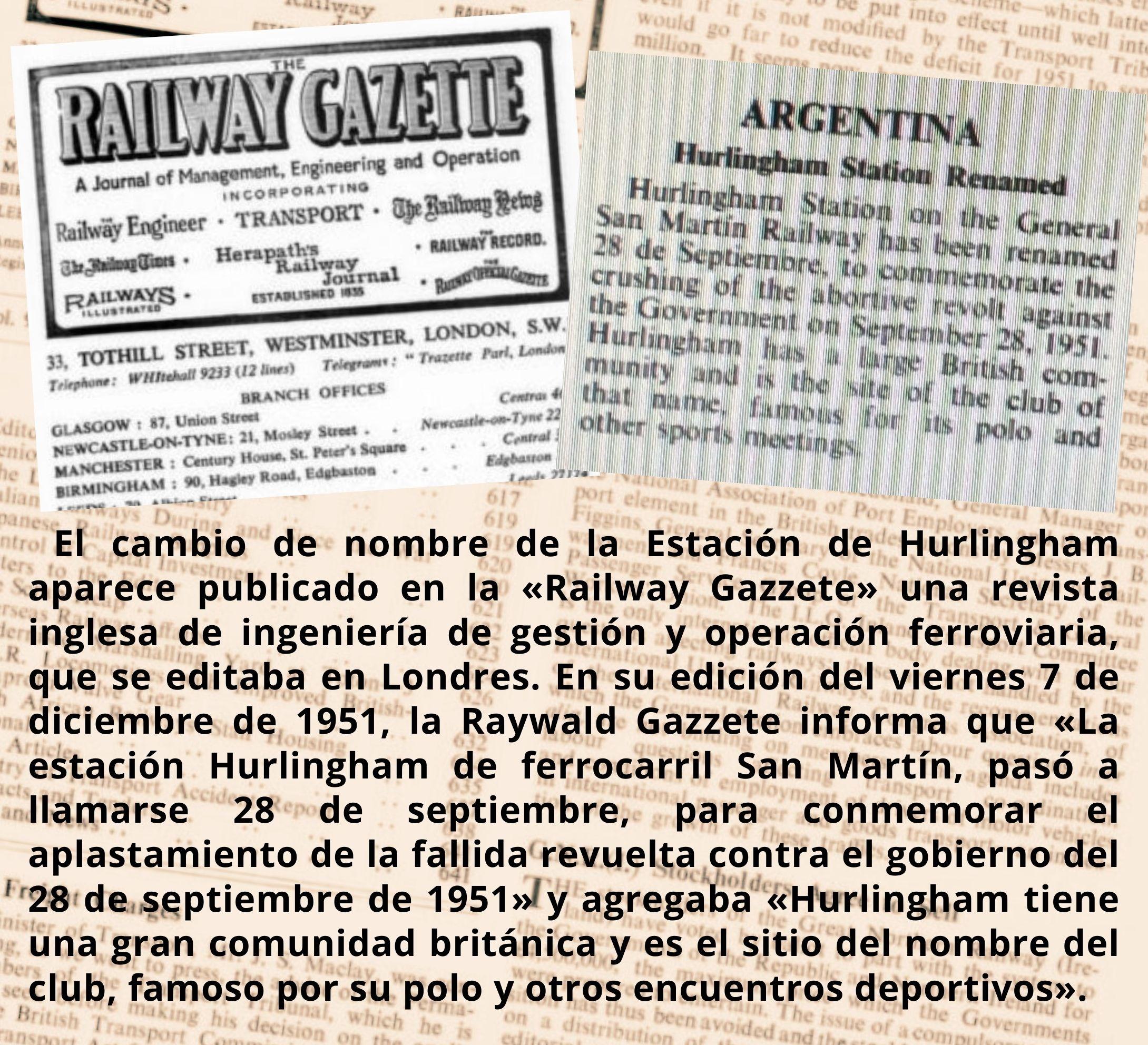 En 1951 a la estación de Hurlingham se la rebautizó «28 de setiembre» y algunos medios de comunicación y desde el gobierno hacían extensivo ese nombre a toda la localidad. ¿Por qué se llamó así?, ¿en qué circunstancias se decidió cambiar el nombre a una estación, a toda una ciudad que era conocida como Hurlingham desde finales del siglo XIX? ¿Qué conmemora esa fecha?