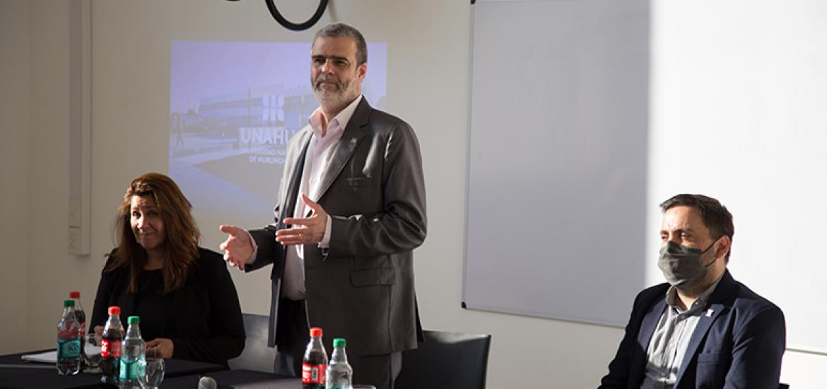 El pasado martes 19 de octubre la Universidad realizó el primer encuentro del flamante Centro Universitario Pyme UNAHUR (CEPyME) con representantes de micro, pequeñas y medianas empresas de la región junto con autoridades del Ministerio de Desarrollo Productivo de la Nación Argentina, el Ministerio de Producción de la Provincia de Buenos Aires y representantes del área de Industria de los municipios de Morón, Hurlingham e Ituzaingó. En el evento estuvieron presentes el vicerrector en Ejercicio del Rectorado, Walter Wallach, el Director de Vinculación Tecnológica de la UNAHUR, Ernesto Gallegos, y la coordinadora del Centro Pyme UNAHUR, Debora Rouille.